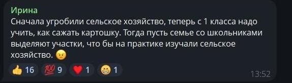 Некоторые вспомнили собственный опыт. «В наше время не было никаких агроклассов, были приусадебное хозяйство и участок на территории школы, где мы копали землю, высаживали деревья и тяпали, пололи сорняки, а также выезжали в поля на прополку подсолнечника», — отметил один из комментаторов.