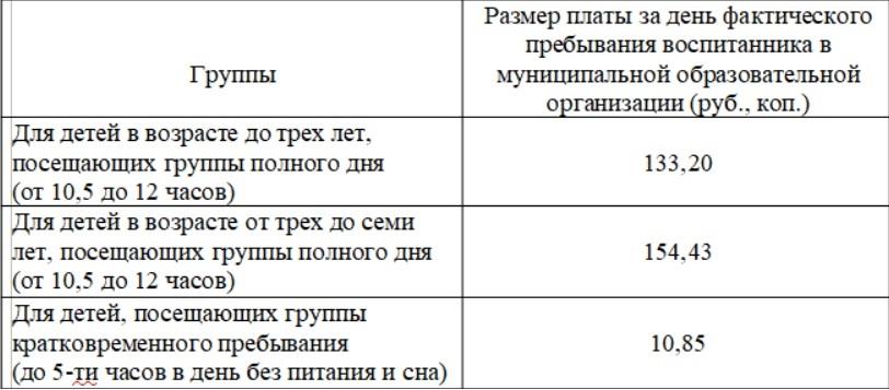 Для детей от 3 до 7 лет оплата за полный день увеличится с 113,5 до 154,4 рубля. Группа неполного дня (до 5 часов без питания и сна) останется по прежнему тарифу — 10,8 рубля.