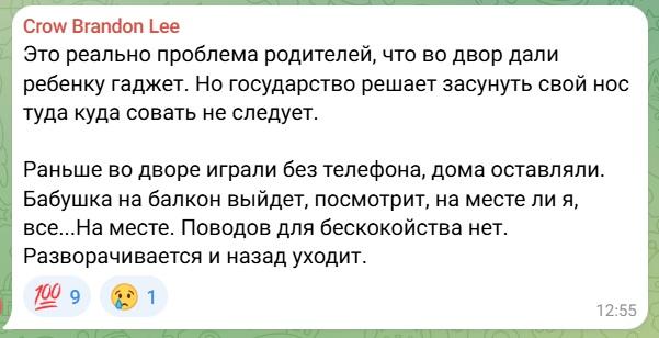 «Странно. Может, все дело в воспитании детей? Моим детям не угрожали ни „Роблоксы“, ни игромании, ни японские аниме, ни секретные чаты. Я без государственных запретов прекрасно справилась с воспитанием своих детей. И не следила никогда за ними в соцсетях».