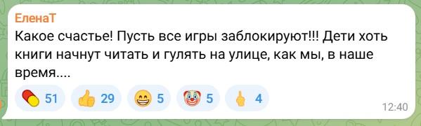 «Серьезно? Бороться с безобидной игрой уровня „агуша гейминг“? Давайте еще дальше пойдем и гаджеты запретим и мультики, чтобы дети, кроме деревянных лошадок и оловянных солдатиков, ничего не видели. Борьба Дон Кихота с ветряными мельницами, ей-богу».