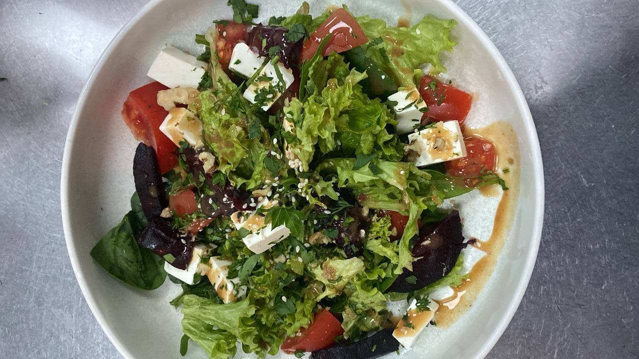 Второй рецепт — салат с печеной свеклой и сыром тофу. Вне поста тофу допускается заменить на сыр фета. Свеклу (100 г) запекают с солью, перцем, прованскими травами, маслом и чесноком примерно 20 минут при 200°C. Время запекания может меняться в зависимости от размера свеклы и особенностей духовки. Остальные ингредиенты: