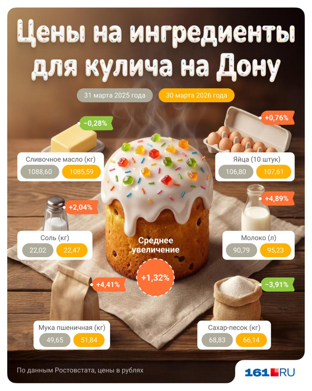 Набор продуктов для приготовления пасхального кулича на шесть порций в среднем по России подешевел на 9%, его стоимость составляет около 148 рублей. Однако в Ростовской области, по данным Ростовстата, аналогичный набор подорожал на 1,32%.