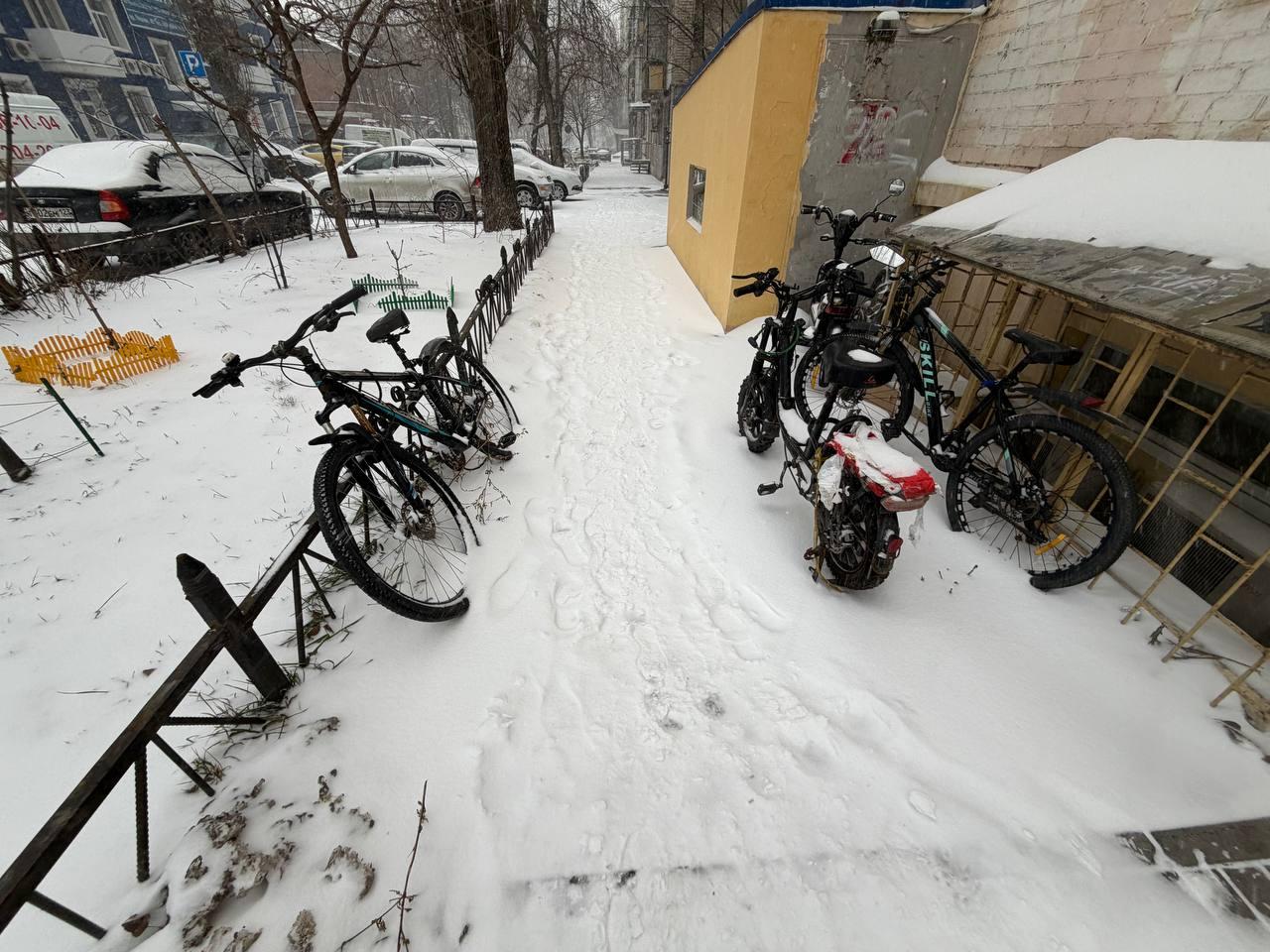 Велосипедистам крайне сложно передвигаться по заснеженным дорогам.