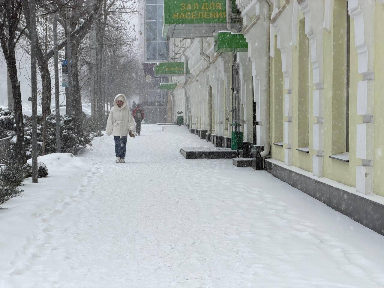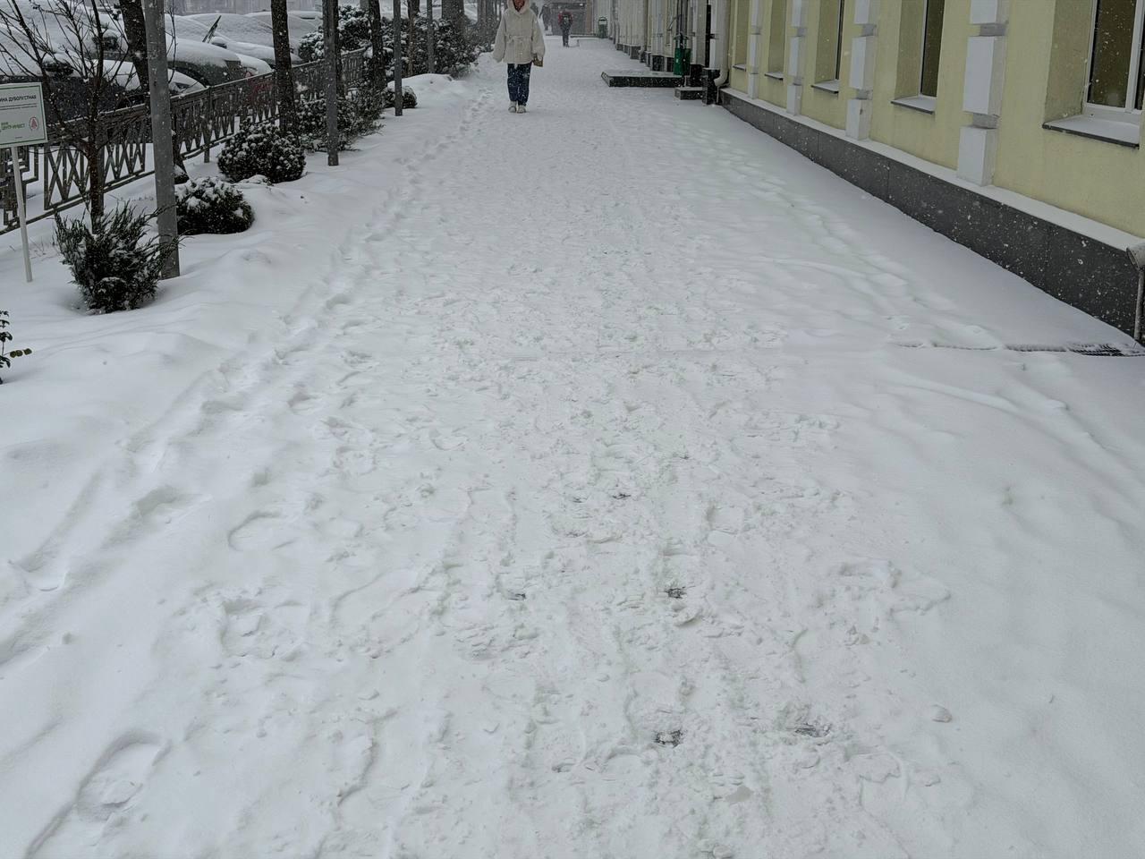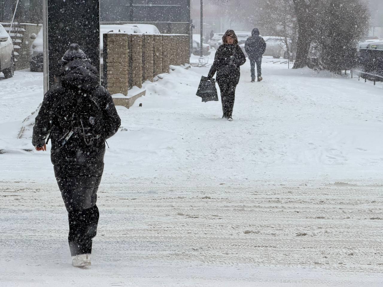 Осадки продолжаются, быстро засыпая тротуары и делая пешеходные пути почти непроходимыми.
