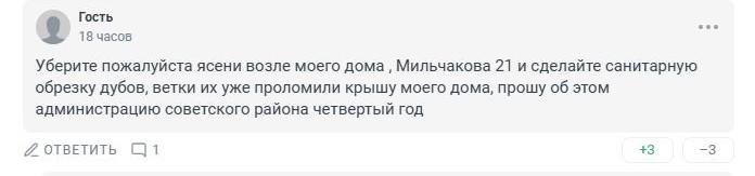 «Я живу на Западном, по моей улице высоченные дубы, крона уже лежит на крыше моего дома. Да и по всей улице Мильчакова вид удручающий: листья дубов зараженные, на них наросты, и никто ни разу не проверил и никогда не обрабатывал. Я посадила сосны, и они, конечно, чахнут. Хотя с 2022 года обращаюсь в администрацию, но воз и ныне там, зато рощу между Зорге и Мильчакова вырубают и строят человейники».
