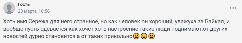«Сережа Зверев — настоящий сибиряк. Он долго боролся за сохранение Байкала! Как он выглядит — это просто имидж. Он очень простой по духу парень», — прозвучало в следующем отзыве.