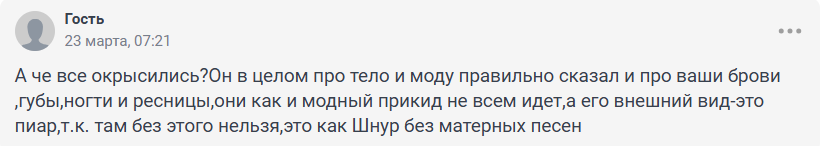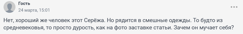 «Сережа — человек эпатажный. Он блюститель чрезмерно яркого и не в меру нелепого образа. Отсюда делаем вывод, что Ростов превращается в деревню из-за того, что тренды на внешность здесь, мягко говоря, деревенские. Я не любитель Москвы, чтобы никто не начал меня за это осуждать, но в прогрессивной части страны вся эта мода на вычурное и однотипное табло прошла давным-давно. Или хотя бы не столь заметна, как здесь. Так что ничего приятного», — резюмировал ещё один критик.