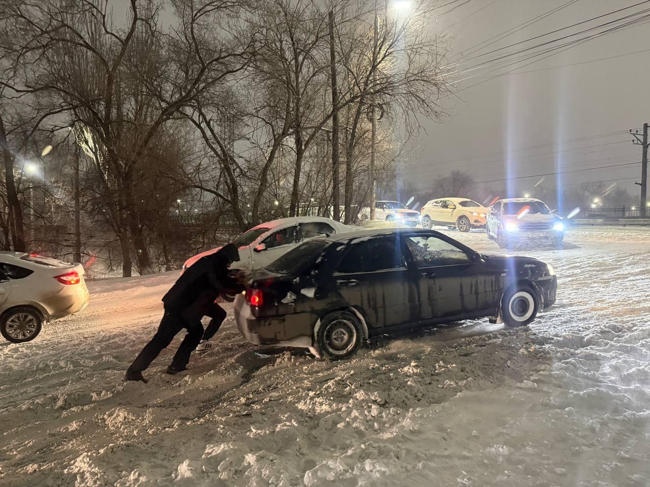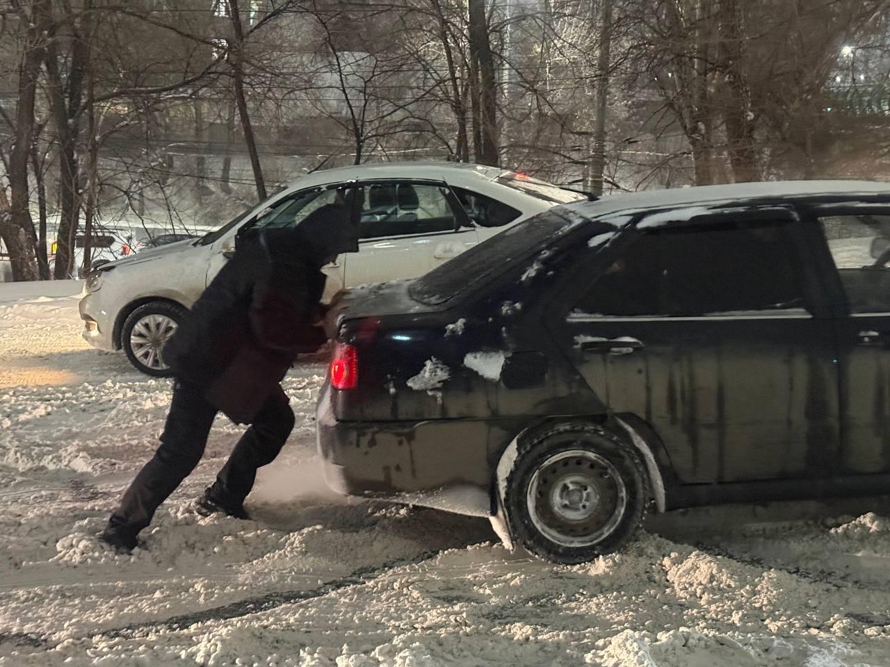 Водители легковых автомобилей оказывают взаимопомощь, а пассажиры общественного транспорта выходят и толкают застрявшие автобусы и маршрутки.