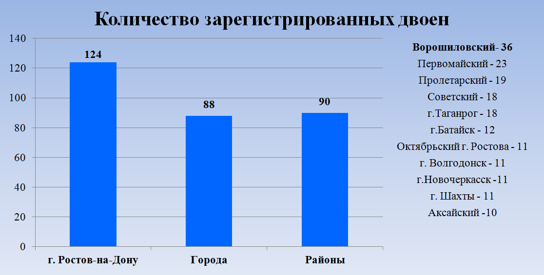 В отчётном периоде зарегистрировано 302 случая рождения двойняшек. Наибольшее число двоен пришлось на Ворошиловский район Ростова-на-Дону. Кроме того, в четырёх семьях родились тройни: по одному случаю в Ворошиловском и Ленинском районах Ростова, а также в Волгодонске и Таганроге.