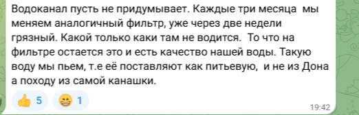 «Водоканал — „красавчик“! Скидывает с себя ответственность за подачу жителям Ростова некачественной воды. При чем тут „управляйки“? Что за бред? Не смешите людей, пожалуйста».
