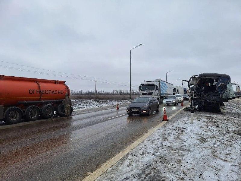 На трассе М-4 в Ростовской области автобус столкнулся с бензовозом