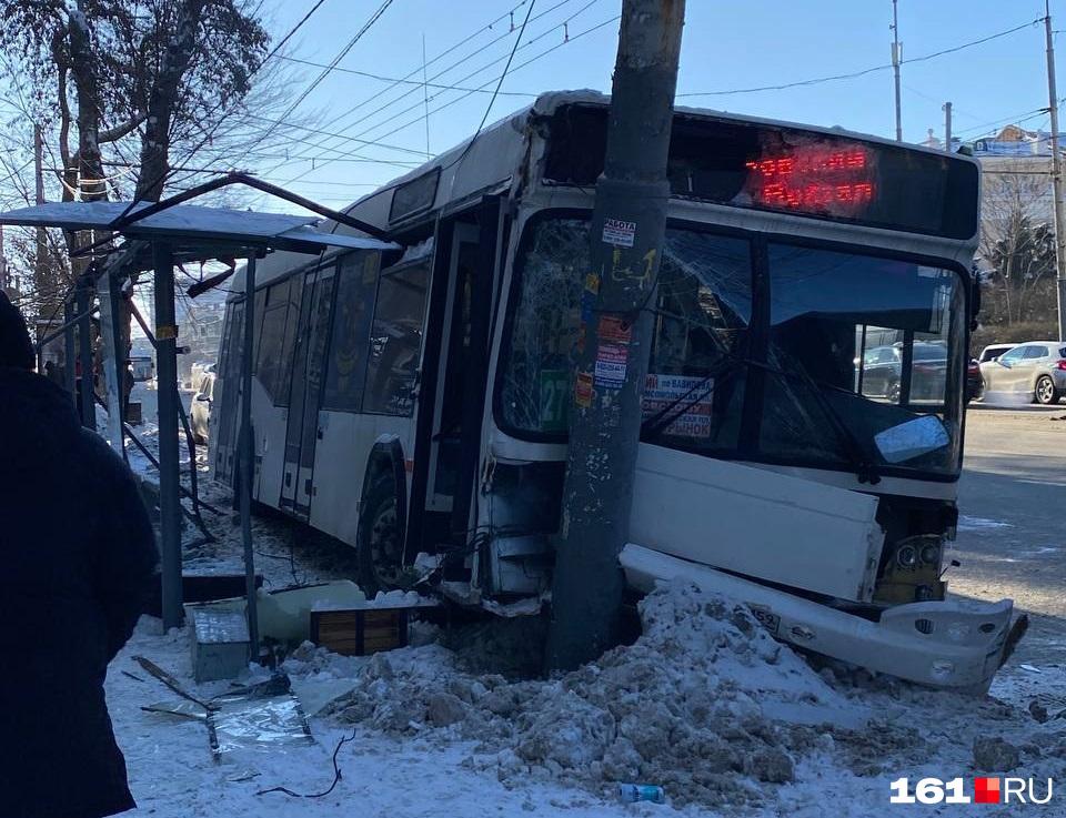 По данным ГАИ Ростовской области, водитель автобуса маршрута №27 при снятии ручного тормоза столкнулся с автобусом №83, после чего его отбросило на остановку и столб.