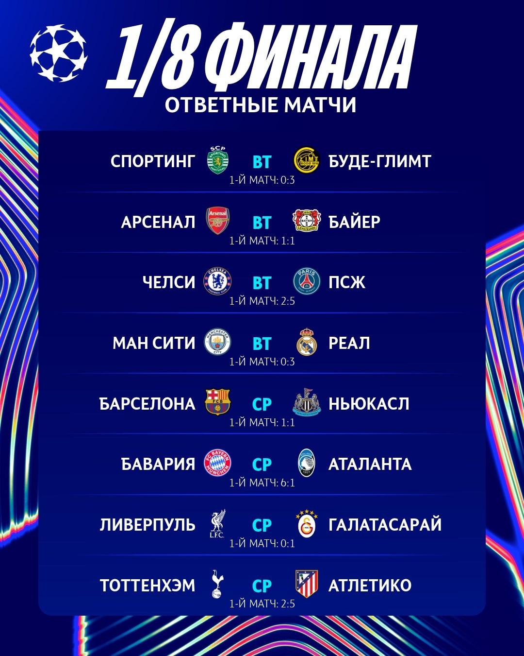 «Челси» — «ПСЖ» (23:00). «Челси» требуется чудо, чтобы отыграть поражение 2:5 с первого матча. Ворота парижан, скорее всего, будет защищать российский вратарь Матвей Сафонов.