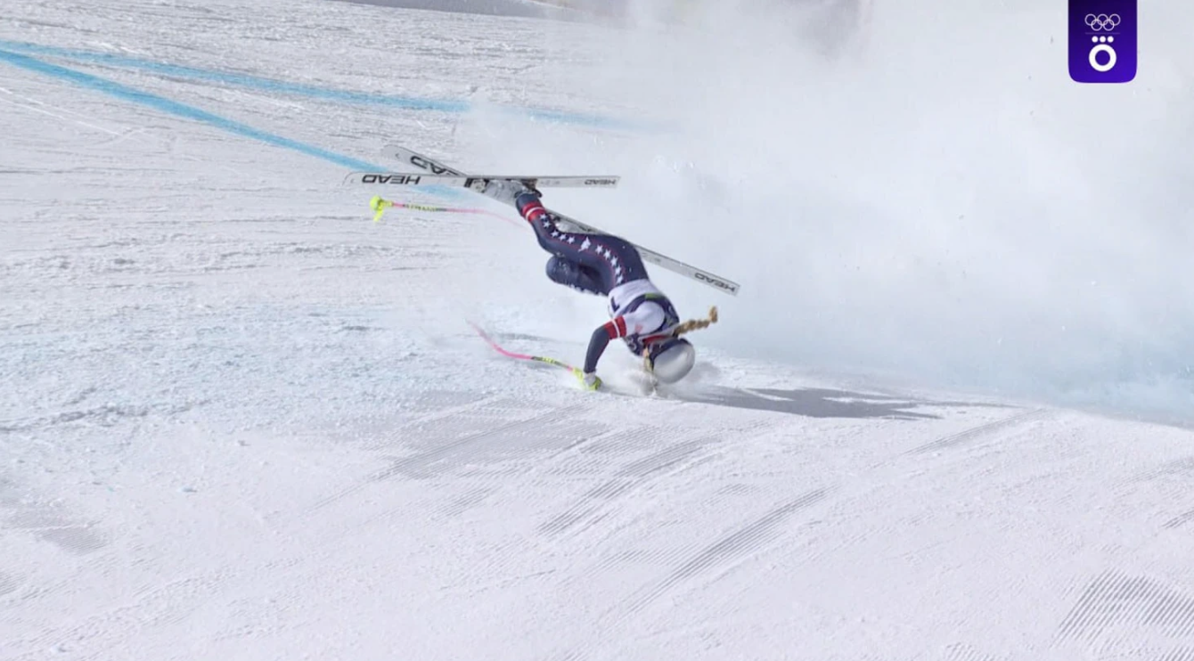 Кадры с момента падения Линдси Вонн на трассе скоростного спуска.