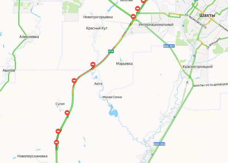 В направлении от Шахт к Ростову на федеральной трассе М-4 «Дон» скопилась пробка длиной около 10 километров. На электронных картах основной участок затора выделен красным цветом.