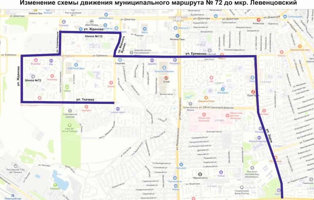 «Также с 28 марта для улучшения транспортного обслуживания Левенцовского микрорайона будет изменена схема движения автобусов по маршруту № 72 по Еременко, Маршала Жукова, Жданова, Солженицына до улицы Ткачева», — отмечается в сообщении.