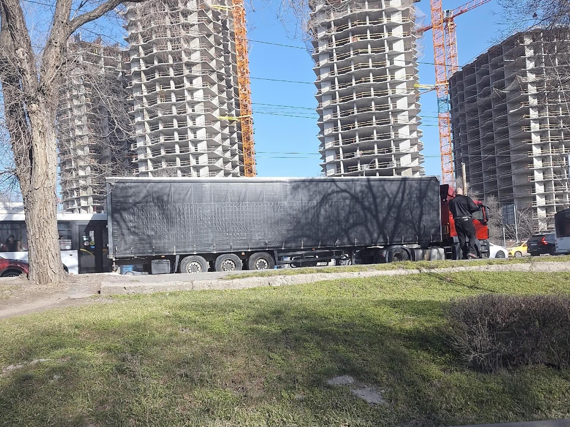 Фура, перегородившая дорогу и вызвавшая пробку на проспекте Стачки