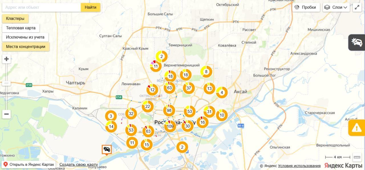 Сервис «Мобилитика» на основе данных Госавтоинспекции обнародовал карту дорожных происшествий в Ростове-на-Дону за 2025 год, выделив перекрестки с наибольшей аварийностью.