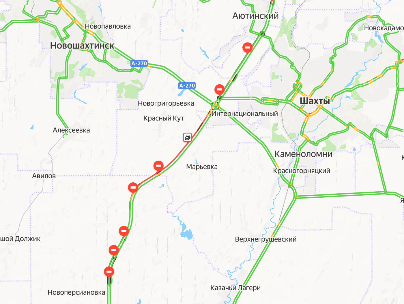 Согласно данным сервиса «Яндекс Карты», пробка скопилась на участке от Аюты до Шахт в направлении Ростова-на-Дону. Причиной образования затора стали дорожные работы и одно дорожно-транспортное происшествие.