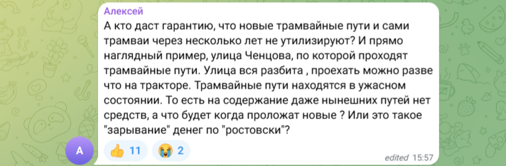 Работы по созданию скоростного трамвая в Ростове-на-Дону существенно замедлились из-за необходимости пересмотра проекта в связи с его удорожанием. На данный момент пути проложены только в пределах Левенцовского микрорайона. Многие жители потеряли надежду на завершение этого транспортного проекта. Часть горожан убеждена, что выделенные средства следовало бы потратить на приобретение электробусов и приведение в порядок дорожного покрытия. Ниже представлены некоторые точки зрения ростовчан.