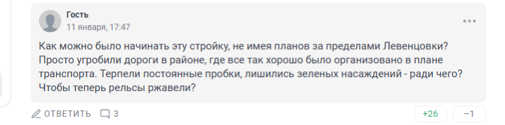 «Смотрите шире. Вся шумиха специально сделана, типа „мы работаем, мы думаем, мы планируем“, а по факту — пузырь, ноль. А в заключение люди по Левенцовке покатаются годик на нескоростном трамвае, и закроют проект за нерентабельностью и неудобством».