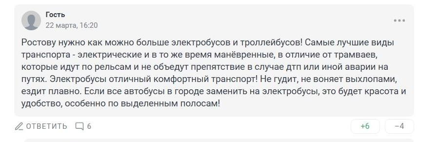 Некоторые высказали скепсис относительно альтернатив. «Какой может быть скоростной трамвай в Ростове-на-Дону? В центре города ему места нет. Там и так тесно. Он только добавит проблем с пробками. Трамвай может между собой связать окраины города, так сказать, спальные районы, которые далеко уже ушли от центра города».