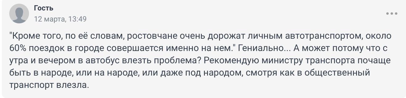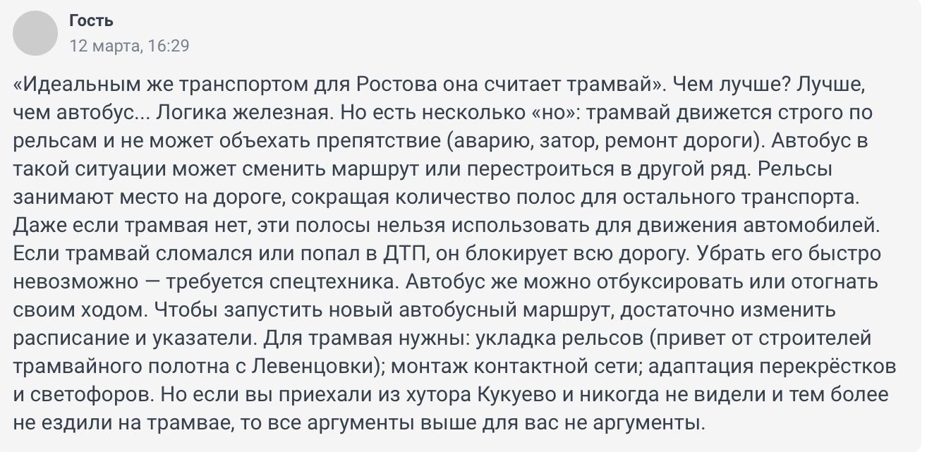 «Может, Минтранс области объяснит, почему в Новосибирске и Екатеринбурге метро есть и соединяет спальные районы с центром города, а в Ростове метро нерентабельно? Нерентабельным оно может быть только по причине интереса, который можно извлечь из наземного транспорта, но не извлечь из подземного».