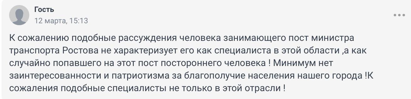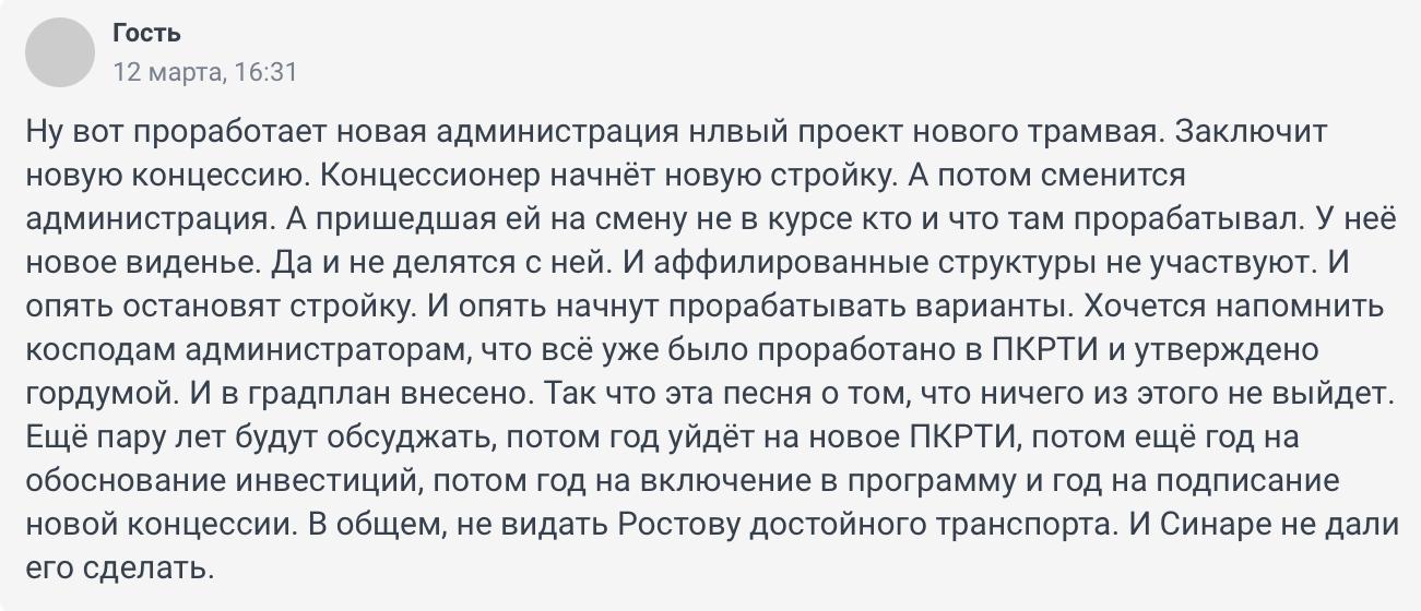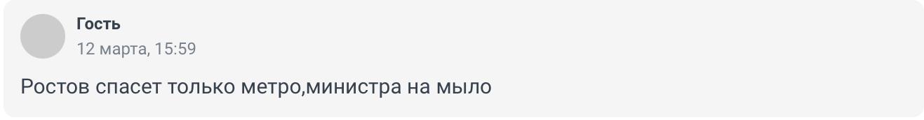 «Метро в Ростове давно бы функционировало, если бы губернаторы, мэры и министры не разворовывали бюджет в течение нескольких десятилетий. Теперь да — воровать стало опасно и чревато последствиями. Теперь пассажиры виноваты в том, что их мало, и Москва больше денег не даст, особенно после того как были украдены средства и построены рельсы из Левенцовки в никуда!»