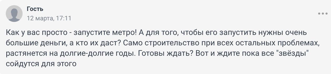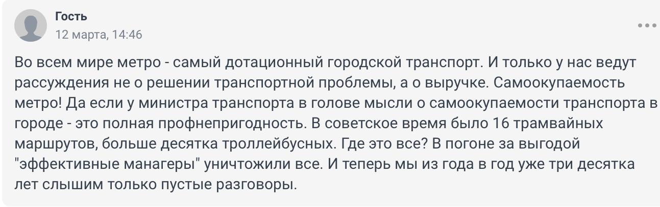«Ройте метро, изверги! Окупаемость? А как насчёт диких пробок и уничтоженной экологии — это как-то учитывается в балансе? Вот вам преимущество социализма. Ведь мы знаем, что метро нужно. Но из-за денег готовы пойти на всё, даже на устаревший трамвай. Сравните, сколько пассажиров вместится в трамвай и сколько в поезд метро. Трамвай вообще не решает проблемы. А в легковых автомобилях народ душится просто потому, что адекватного способа попасть из одной точки в другую нет! И это также связано с железной дорогой, которая разрезала мегаполис пополам. Естественно, автобусы не могут её преодолеть».