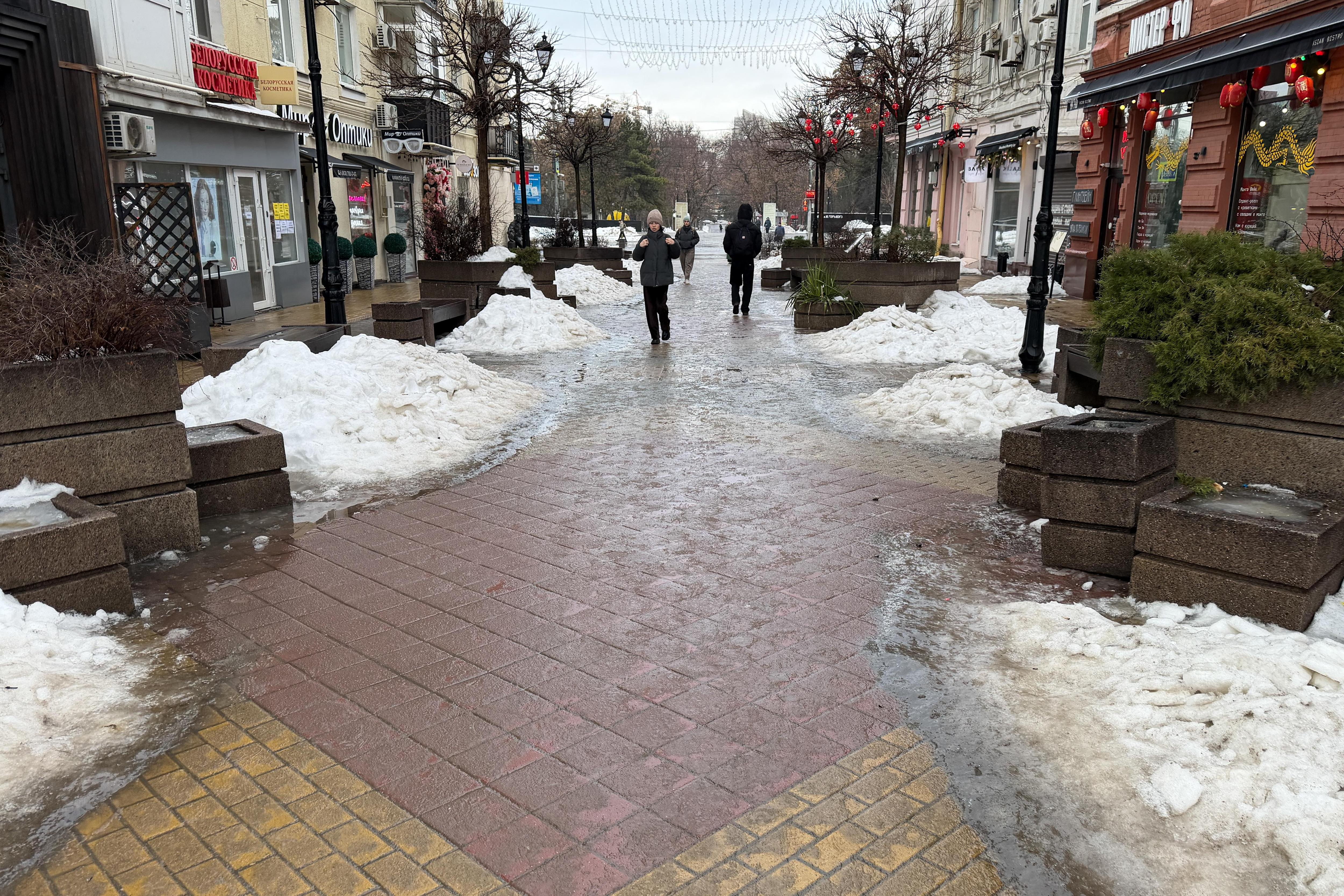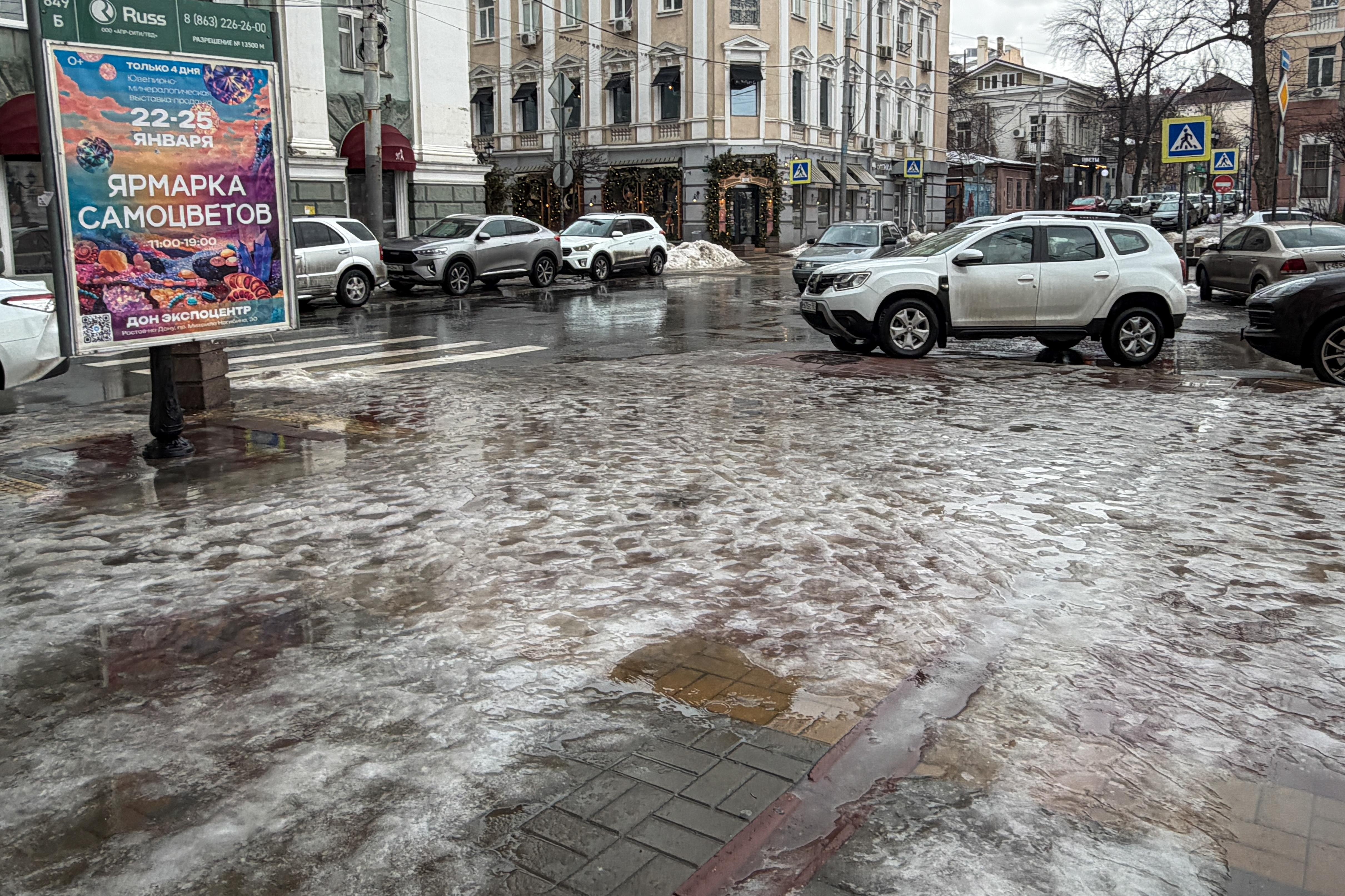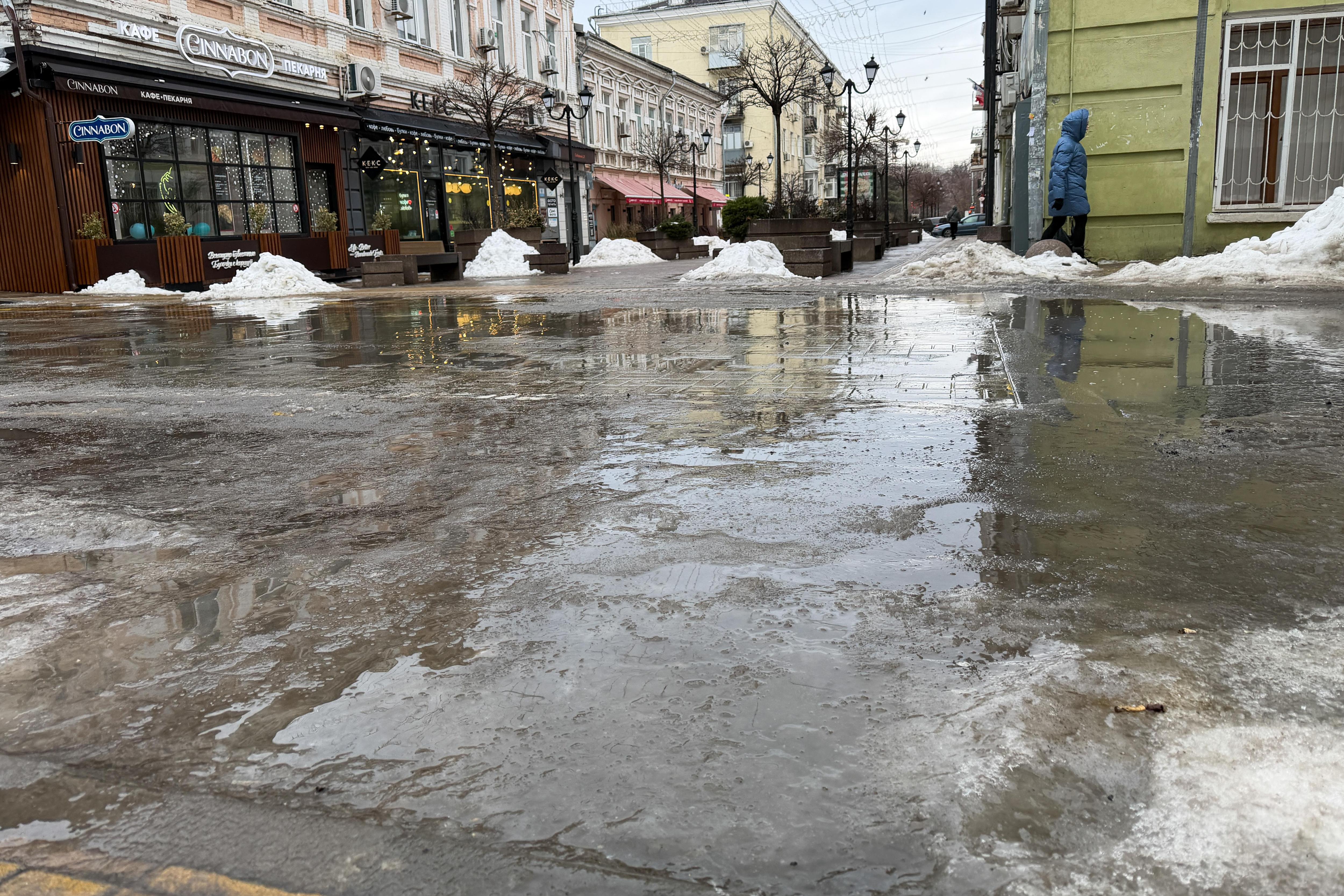 Потепление в Ростове привело к гололеду из-за таяния неубранного снега.