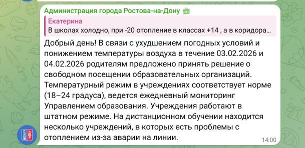 Администрация Ростова-на-Дону объявила о сохранении режима свободного посещения для городских школ в четверг, 4 февраля. Это решение связано с продолжающимися неблагоприятными погодными условиями, включая сильные холода. Соответствующее уведомление было размещено властями в комментариях к публикации мэра Александра Скрябина.