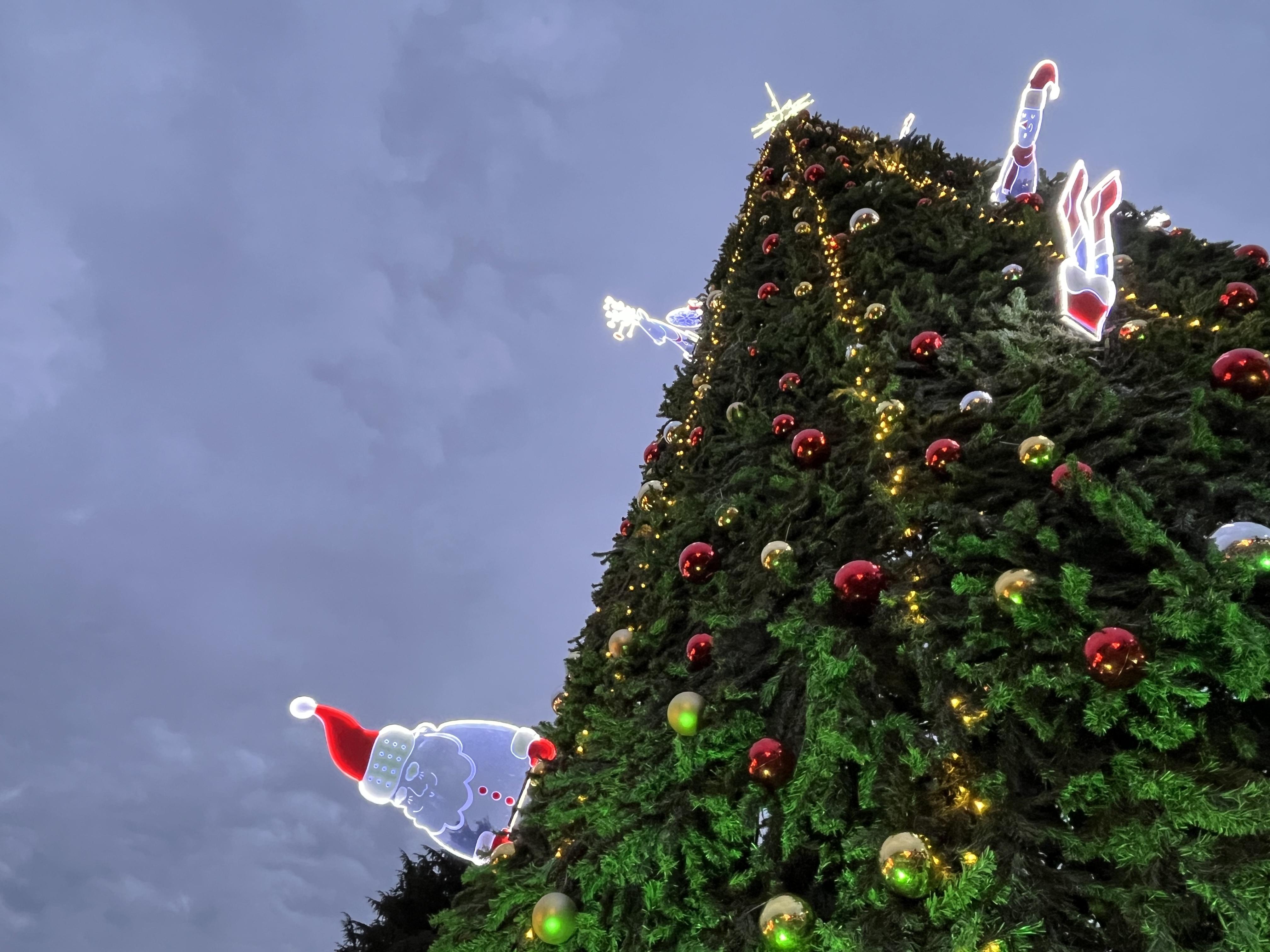Праздничные ёлки стоят рядом с пальмами, создавая яркий контраст.