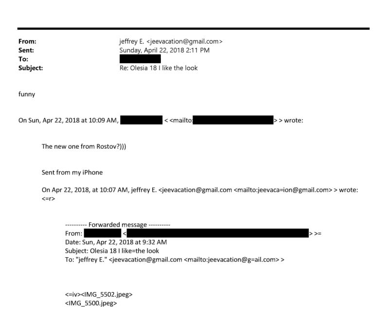 Согласно документам, 22 апреля 2018 года неизвестный отправитель (имя скрыто) направил Эпштейну два фотографии, сами снимки в деле отсутствуют. Тема письма гласила: «Олеся 18. Мне нравится, как она выглядит». В тексте сообщения собеседник поинтересовался: «Новенькая из Ростова?)))» На что Эпштейн ответил: «Забавная».